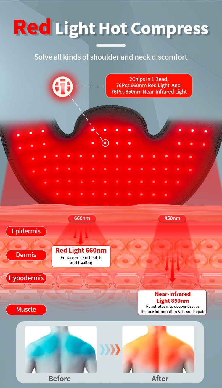 Ši raudona ir beveik infraraudonųjų spindulių šviesos terapija gali būti naudojama kūnui, norint palengvinti skausmą, atpalaiduoti raumenis, ir yra universali ir nešiojama. LED terapija Lengvos pečių juostos diržas yra pagamintas iš aukštos kokybės ir minkšto audinio, kuris suteikia patogų prisilietimą prie jūsų odos. Led Terapija. Šviesos pečių diržo diržas suteikia patogų kasdienio priežiūros sprendimą pečių ir kaklo sveikatai per neinvazinę fizinę terapiją, ypač tinkami asmenims, kuriems reikia ilgalaikio peties ir kaklo problemų kondicionavimo arba siekiant atsipalaiduoti.